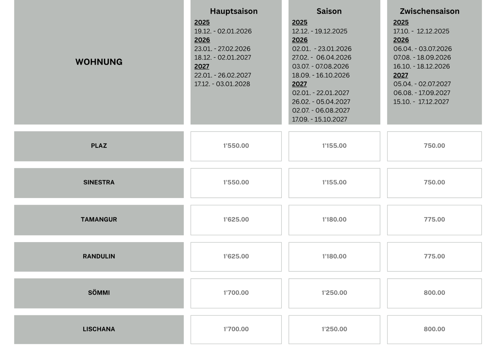 Wir weisen Wochenpreise in CHF inkl. Mehrwertsteuer aus. Im Preis inklusive: Bett-, Bad-, Küchenwäsche. Die Endreinigung und Kurtaxen bezahlen Sie extra. Für die Endreinigung verrechnen wir CHF 180.00 pro Wohnung.